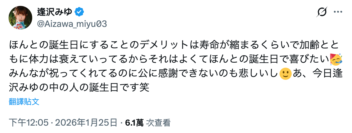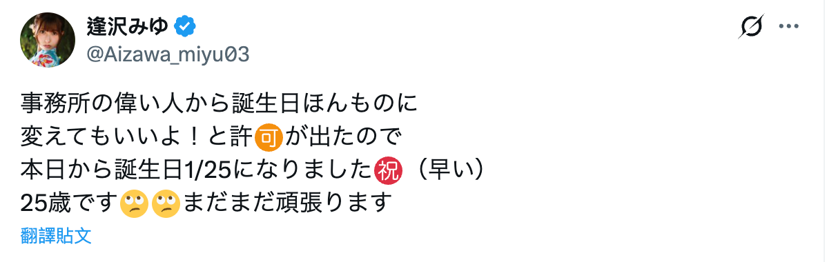 Miyu Aizawa has now revealed her real birthday, on January 25 she announced it, after receiving permission from her agency leaders, she told fans that from now on she will celebrate January 25 as her actual birthday, and that she is turning 25 years old.
