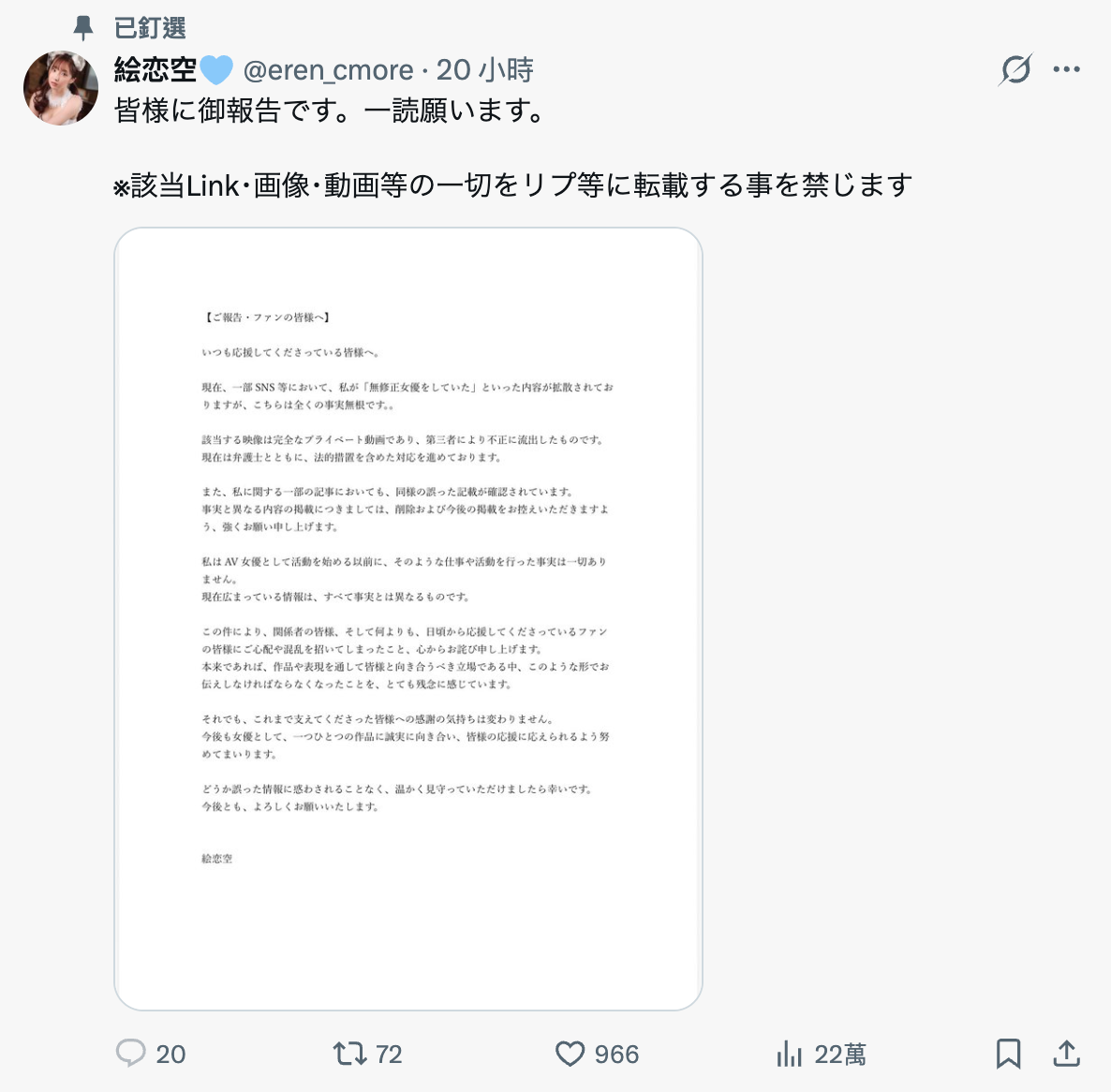 So the statement makes two main points clear. First Sora Eren admits that uncensored footage of her exists online. But it is private material. Someone leaked it without her knowledge or permission. It did not come from any professional work. Second she has not released new work since last September. She stayed mostly active on social media. Now she clearly says she will perform diligently in future projects. This means she plans to continue her career. She will release more titles later. Please look forward to it. (Strategy: Component unpacking + Connector weakening)
